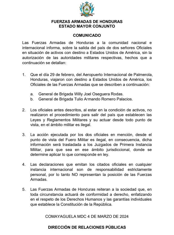 Las Fuerzas Armadas de Honduras (FFAA) a la comunidad internacional y nacional informa, sobre la salida de los dos señores oficiales en situación activo con destino a Estados Unidos en América, sin autorización de las autoridades militares respectivas", dice el comunicado sobre el viaje de los dos generales.