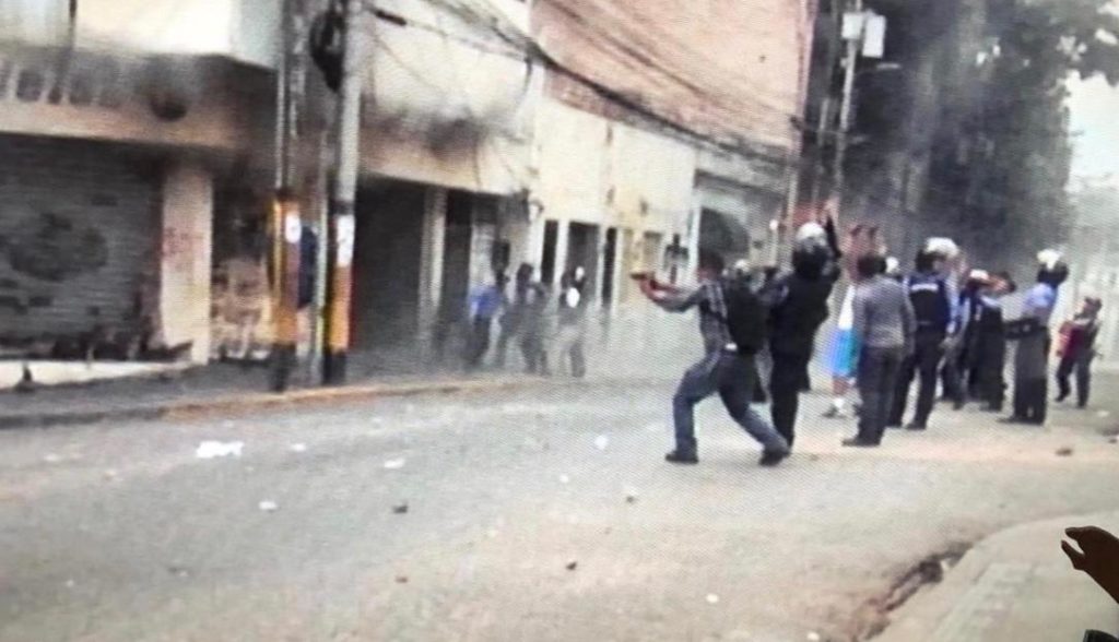 Las cámaras de UNE TV captaron las imágenes de dos hombres, con las características típicas paramilitares, que ante la vista y paciencia de los miembros de la policía nacional, empuñaban sus armas y dispararon contra la humanidad de los manifestantes.
