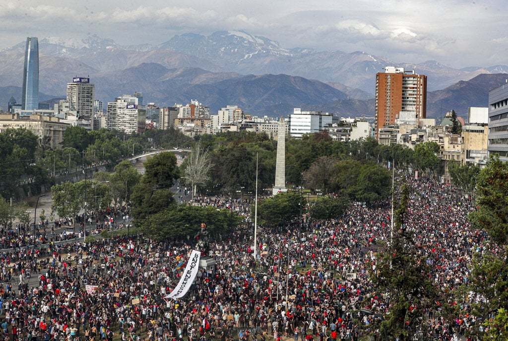 Las protestas estudiantiles por un alza en el transporte subterráneo derivaron el 18 de octubre en disturbios en los que el metro resultó con daños graves e incendios, así como en saqueos de supermercados y farmacias, entre otros comercios. Esas protestas iniciales derivaron luego en manifestaciones multitudinarias que no han cesado y las redes sociales difunden nuevas convocatorias para la semana próxima.