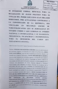 ‘Se interpone formal denuncia para la realización de juicio político para el titular del poder Ejecutivo, Juan Orlando Hernández, por actuaciones contrarias a la Constitución de la República, ser vinculado en múltiples juicios de narcotraficantes que se judicializan en Estados Unidos y que lesionan el interés nacional e internacional y su manifiesta negligencia, incapacidad e incompetencia para el desempeño del cargo que ilegalmente ostenta’, cita el documento.