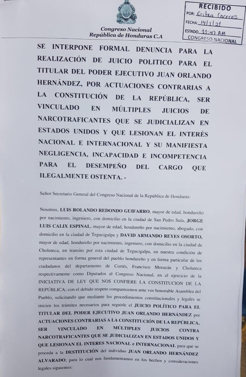 ‘Se interpone formal denuncia para la realización de juicio político para el titular del poder Ejecutivo, Juan Orlando Hernández, por actuaciones contrarias a la Constitución de la República, ser vinculado en múltiples juicios de narcotraficantes que se judicializan en Estados Unidos y que lesionan el interés nacional e internacional y su manifiesta negligencia, incapacidad e incompetencia para el desempeño del cargo que ilegalmente ostenta’, cita el documento.