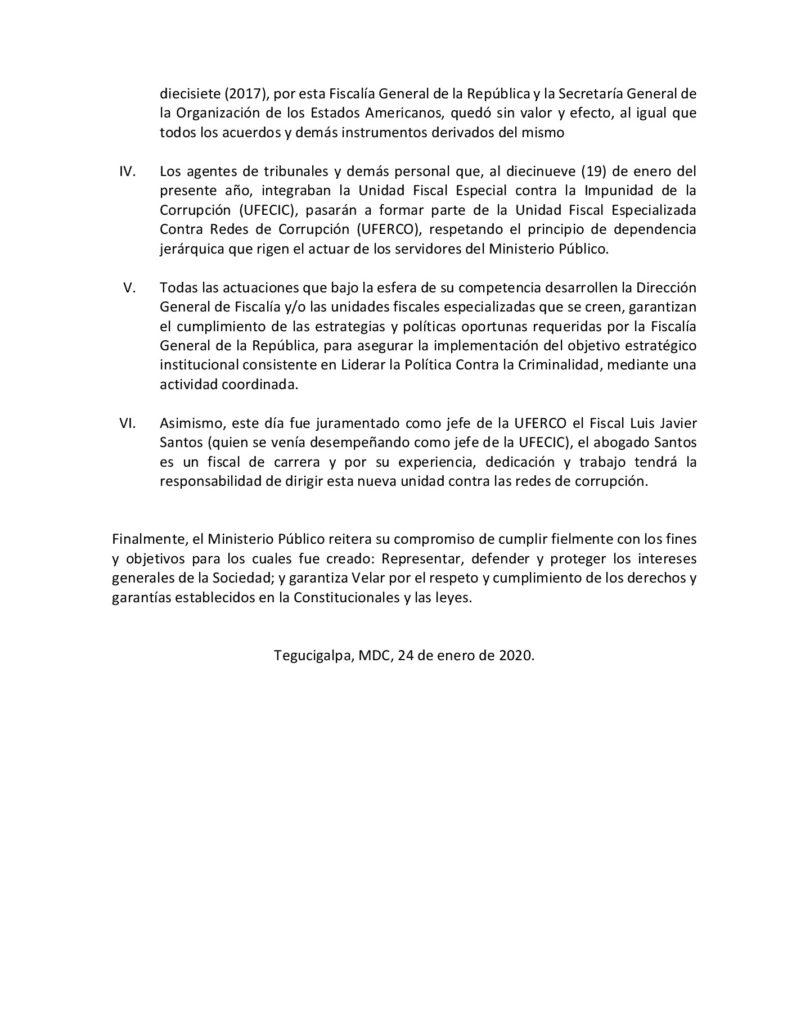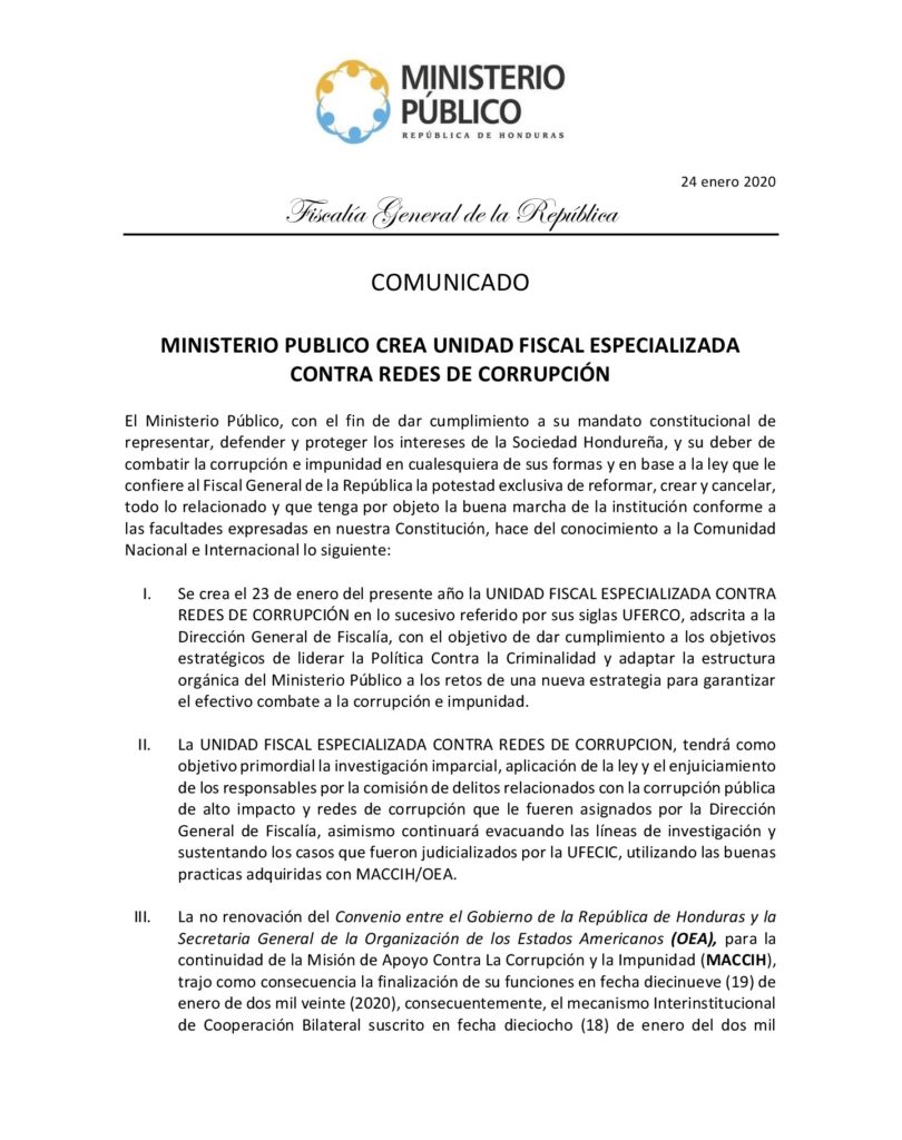 Además, se explica que al no renovar el convenio de la Misión de Apoyo Contra la Corrupción e Impunidad en Honduras (MACCIH), la Ufecic quedó sin valor y efecto.